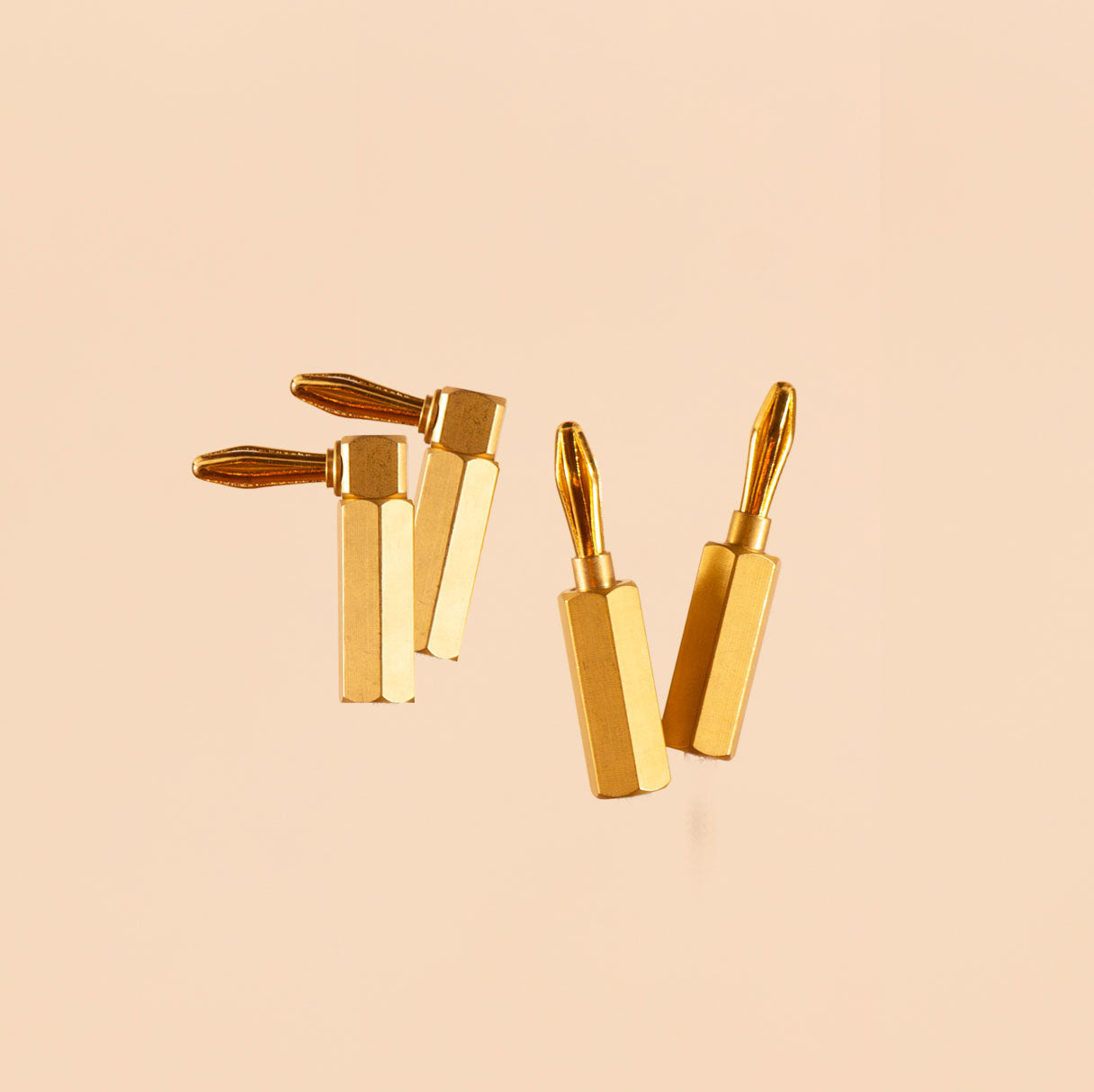 A pair of banana plugs with raw brass collars, either straight or 90-degree.