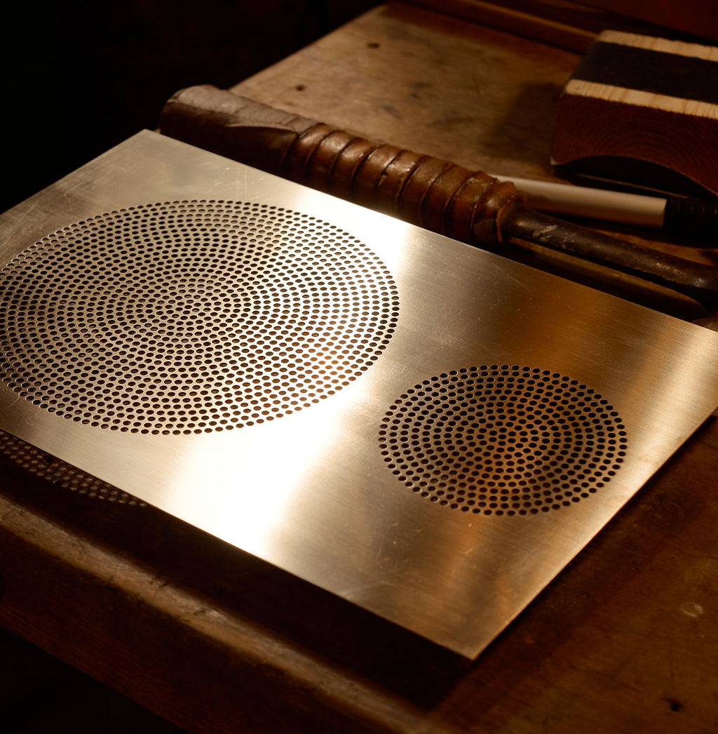 We don't use veneer and we don't use lacquer, because we want these speakers to breathe a little bit. We use natural materials -- European birch plywood and raw brass -- materials that patina and get better with age.